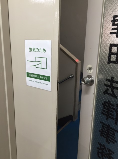 事務所内の換気のため,事務所の入り口を少し開けております。